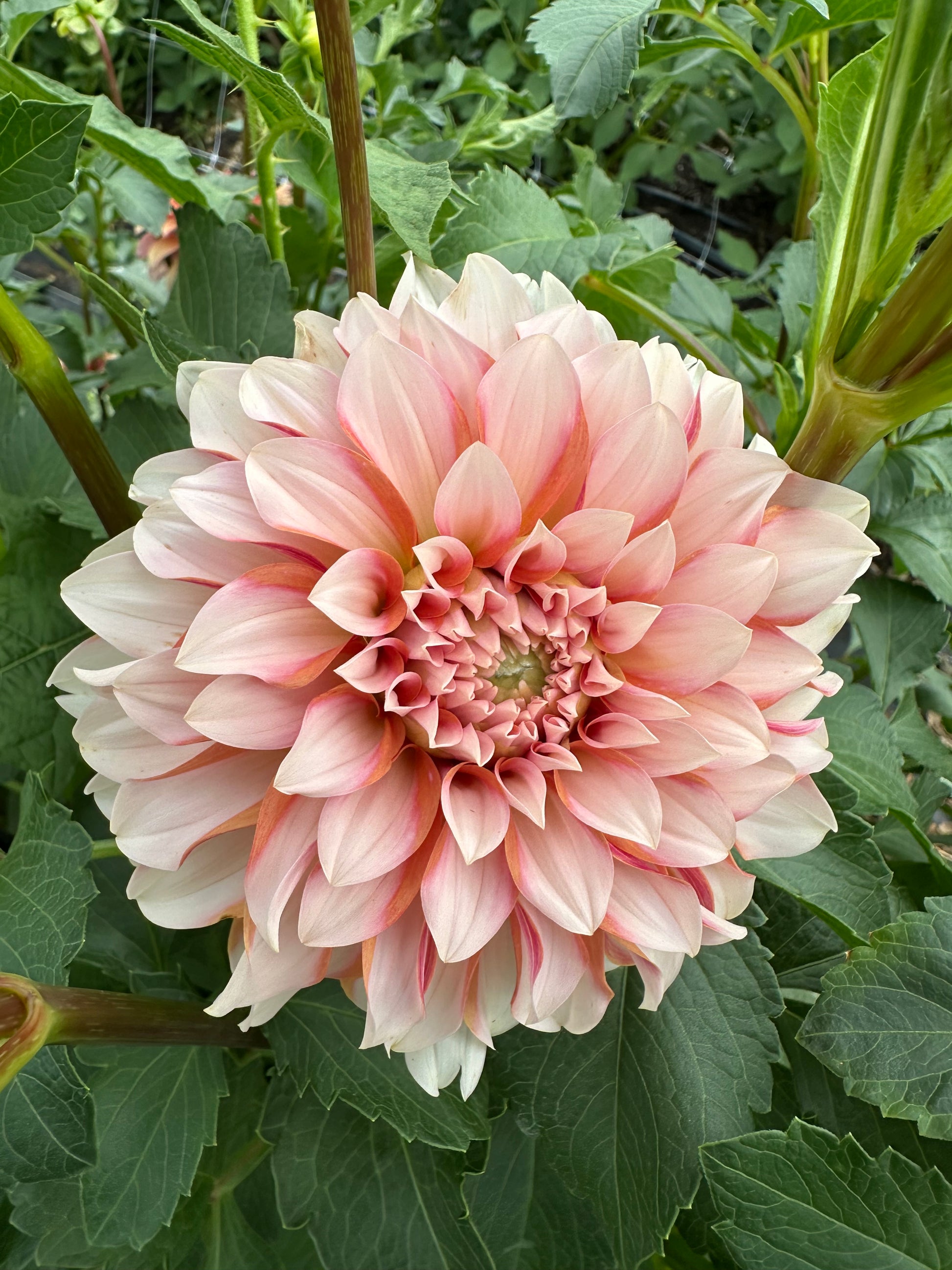 A 4-inch decorative dahlia with an apricot base fading to a soft blushy beige.